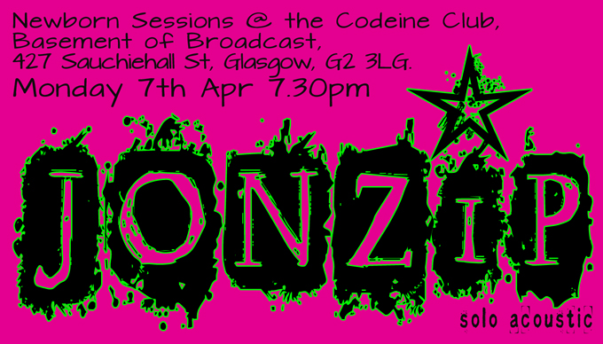 or an email to - info@thezips.co.uk – with the header JONZIP @ CODEINE CLUB 7/4 if you would like to come along to this solo acoustic gig on Monday 7th April.